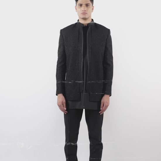 Black Silk Floral Embroidery Open Bandhgala Set
