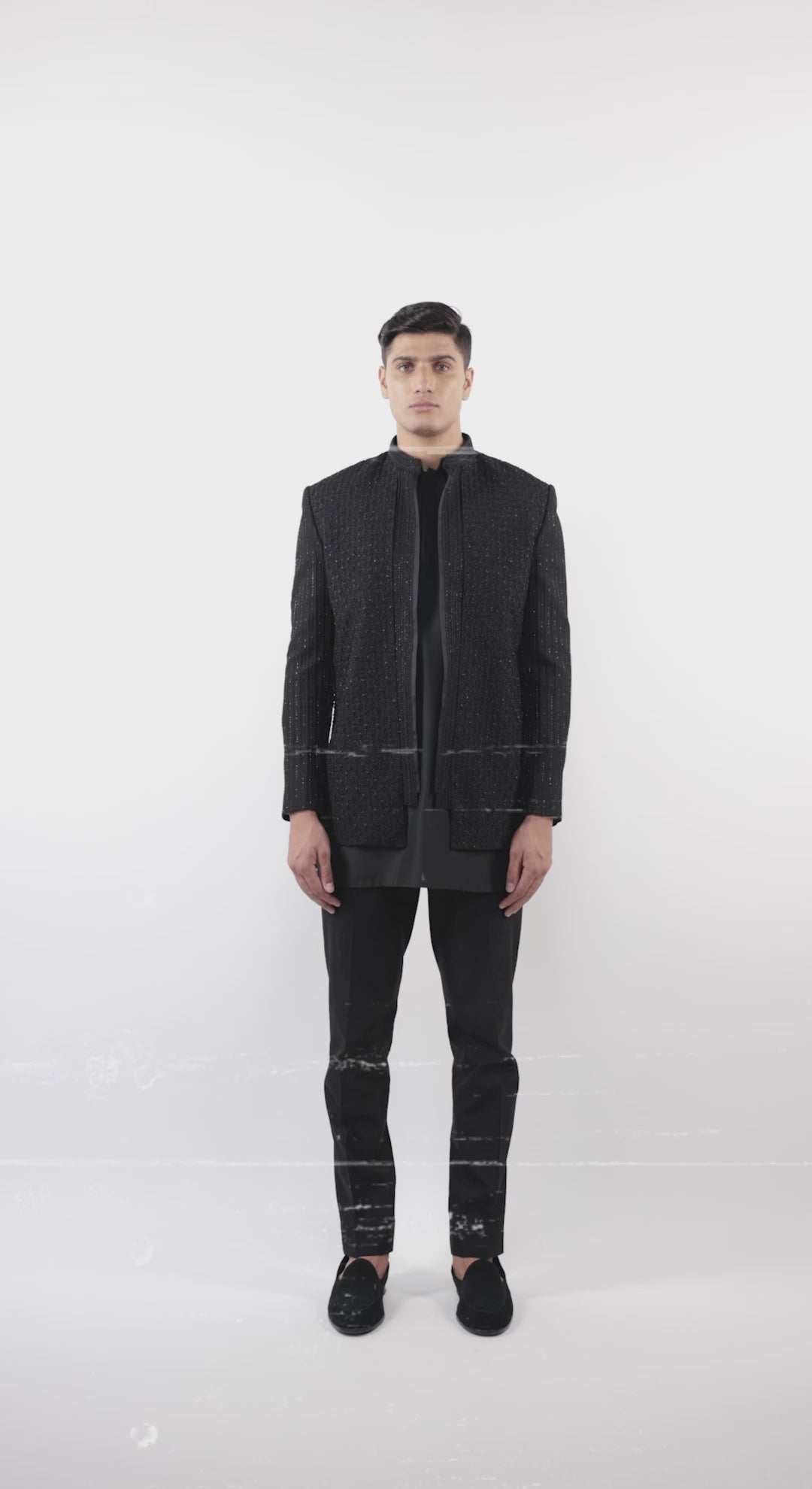 This floral-embroidered open bandhgala is a versatile choice for reception, sangeet, ethnic, or festive events. Pair with slim-fit trousers and textured footwear.