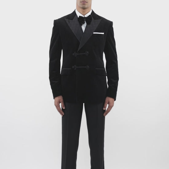 Black Velvet Peak Lapel Double Breasted Knot Closure Tuxedo Set