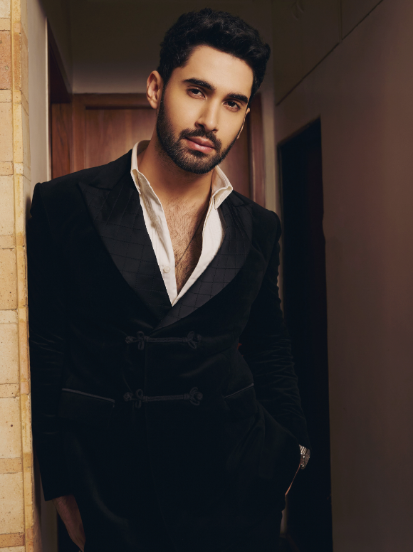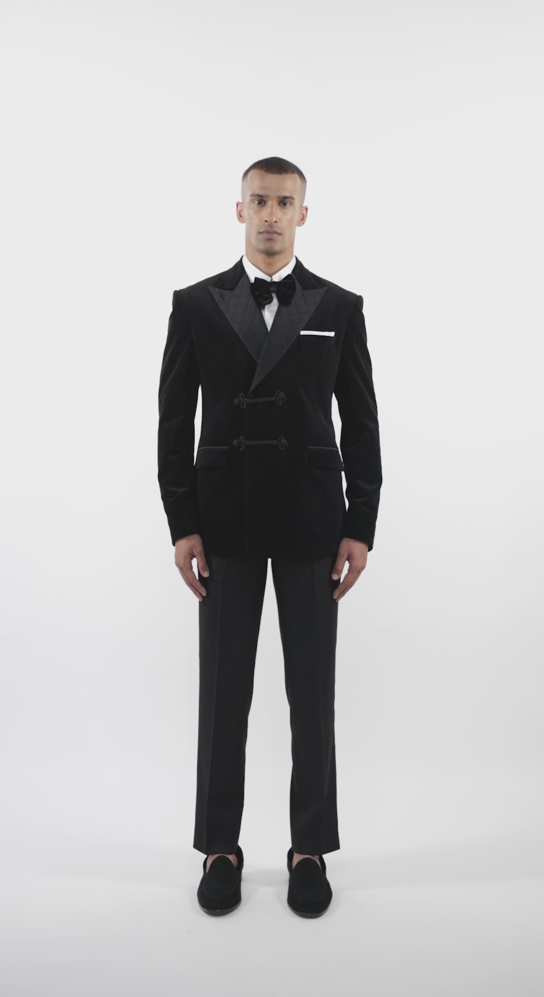 This black velvet tuxedo set with cutdana embellishments on the shawl lapel is ideal for reception, sangeet, or cocktail events.