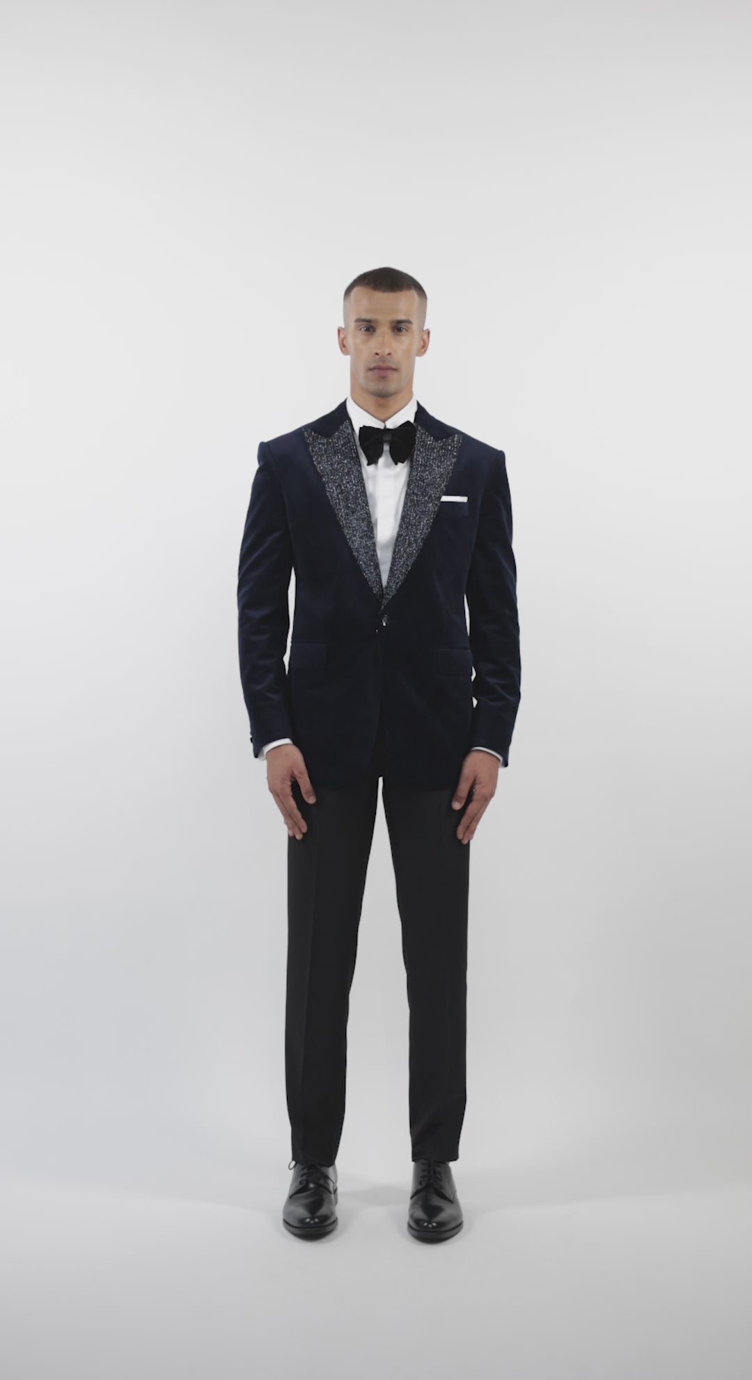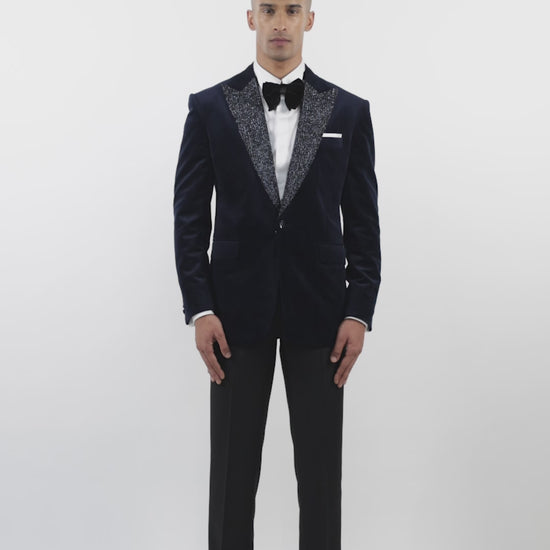The navy blue velvet tuxedo with cutdana embellishments and a peak lapel is perfect for a luxurious reception, sangeet, or cocktail affair.